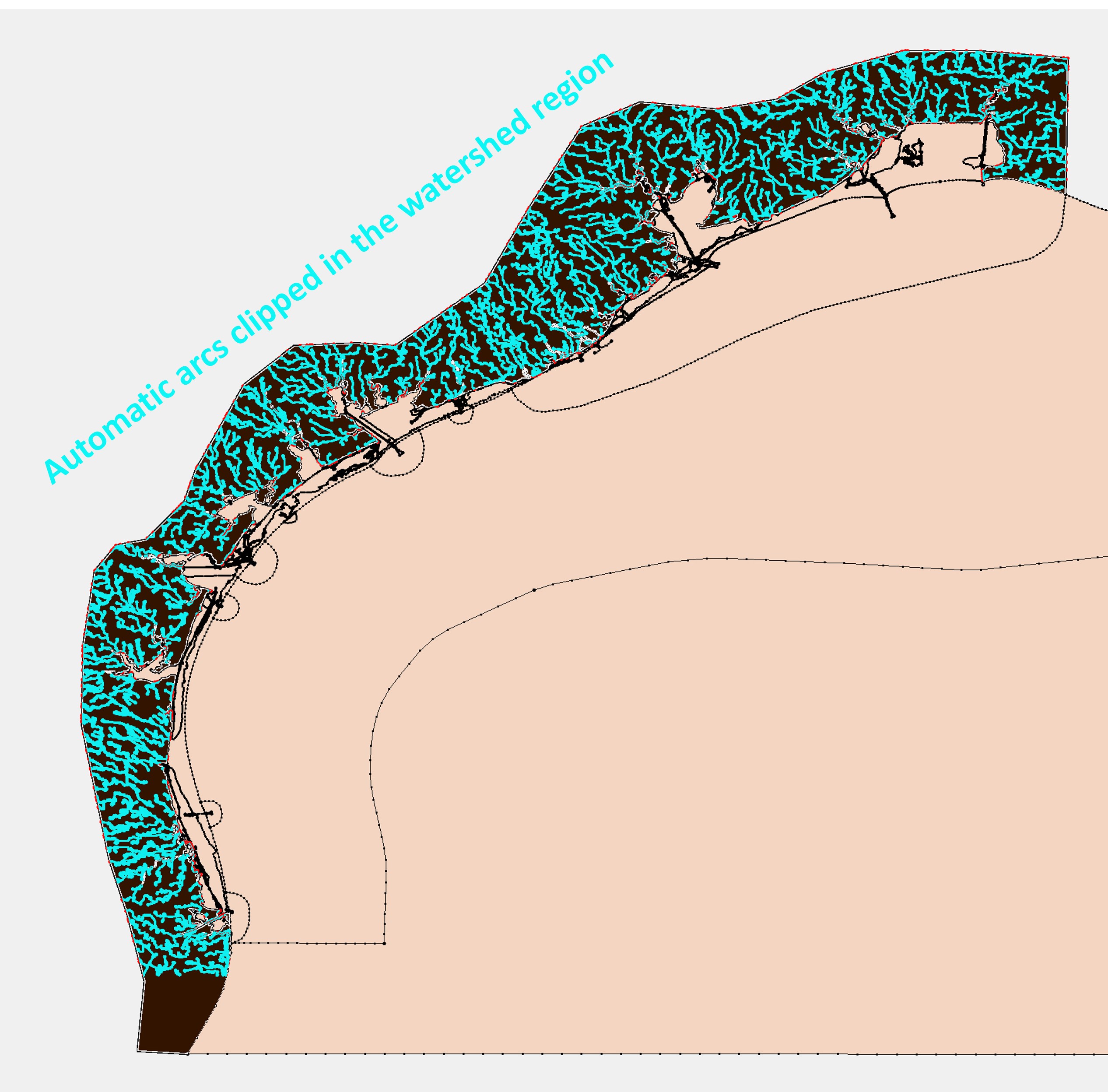 Typically, we want to put the automatic arcs (watershed rivers) only in the extended region. This can be done in various ways, e.g., using GIS tools or scripts.