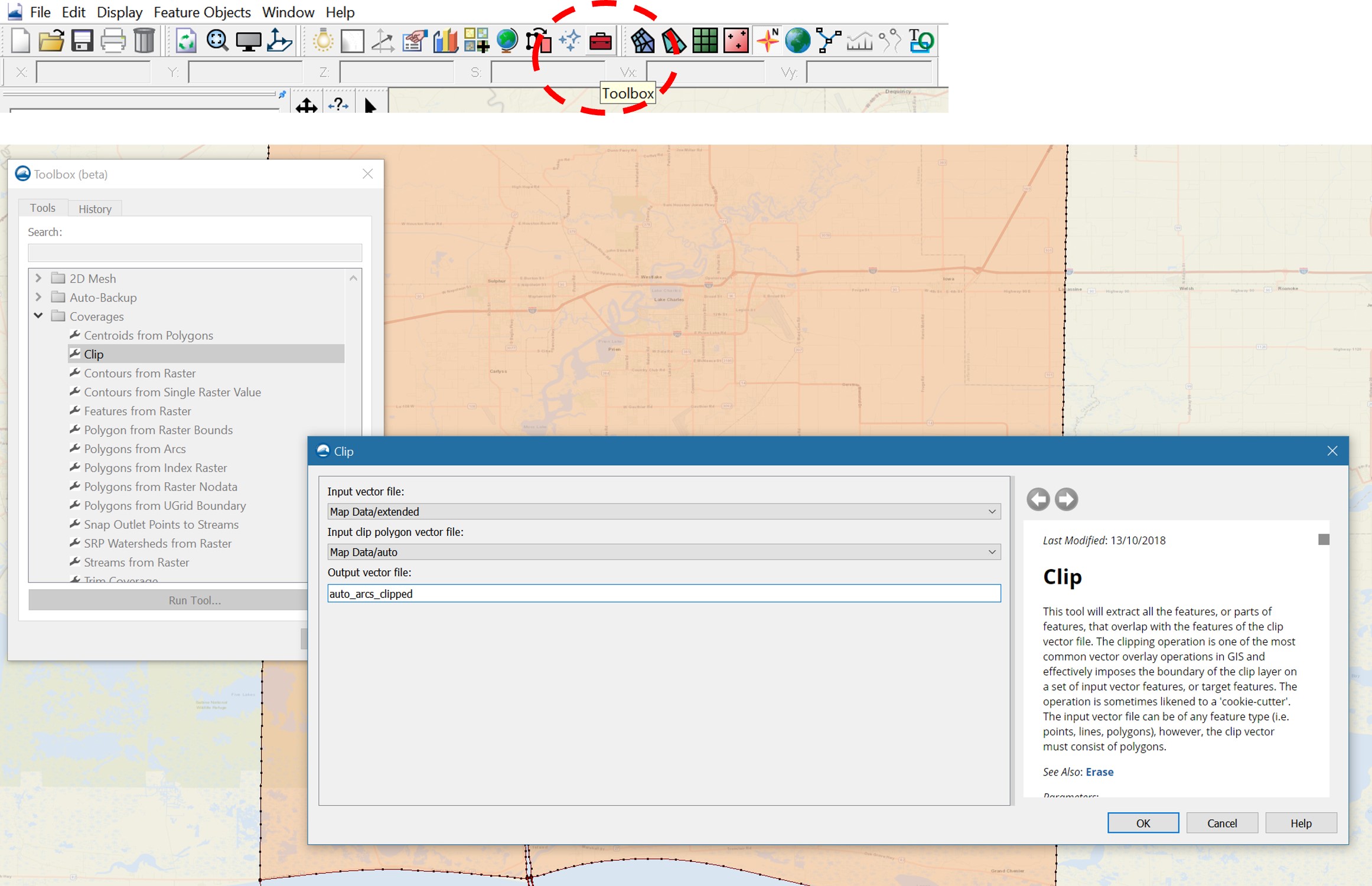 For this simple project, using SMS or GIS tools is straightforward, and here is an example using the clipping tool (similar to that in ArcGIS or QGIS) inside SMS: