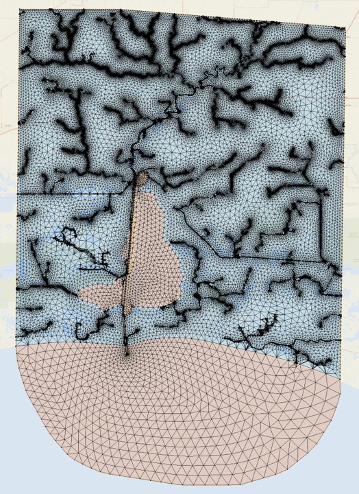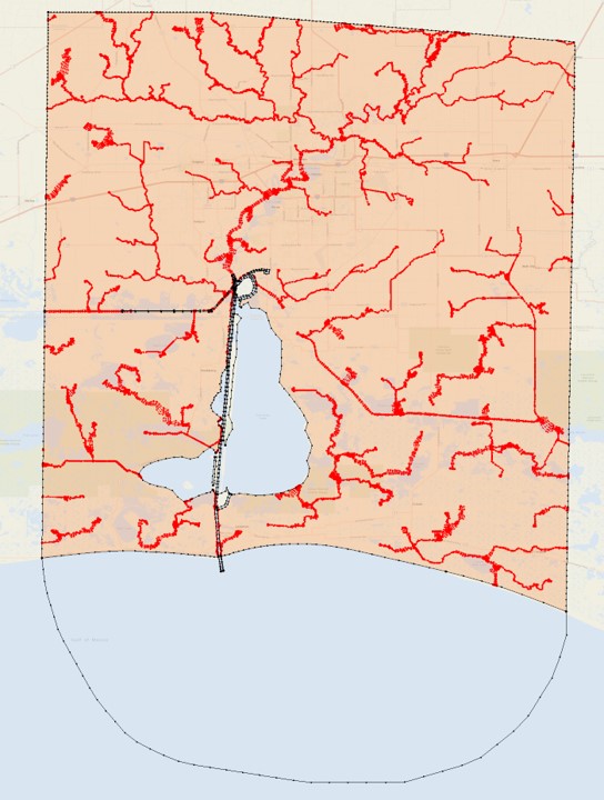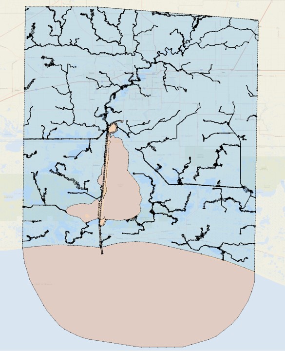 This project has an additional component in the map module, i.e., the levee and dam system from the National Levee Database. In a more complex project like this one, it is recommended to use a script to clip the automatic arcs inside the extended (watershed) region. The SCHISM Git repo provides a clipping script for SECOFS: