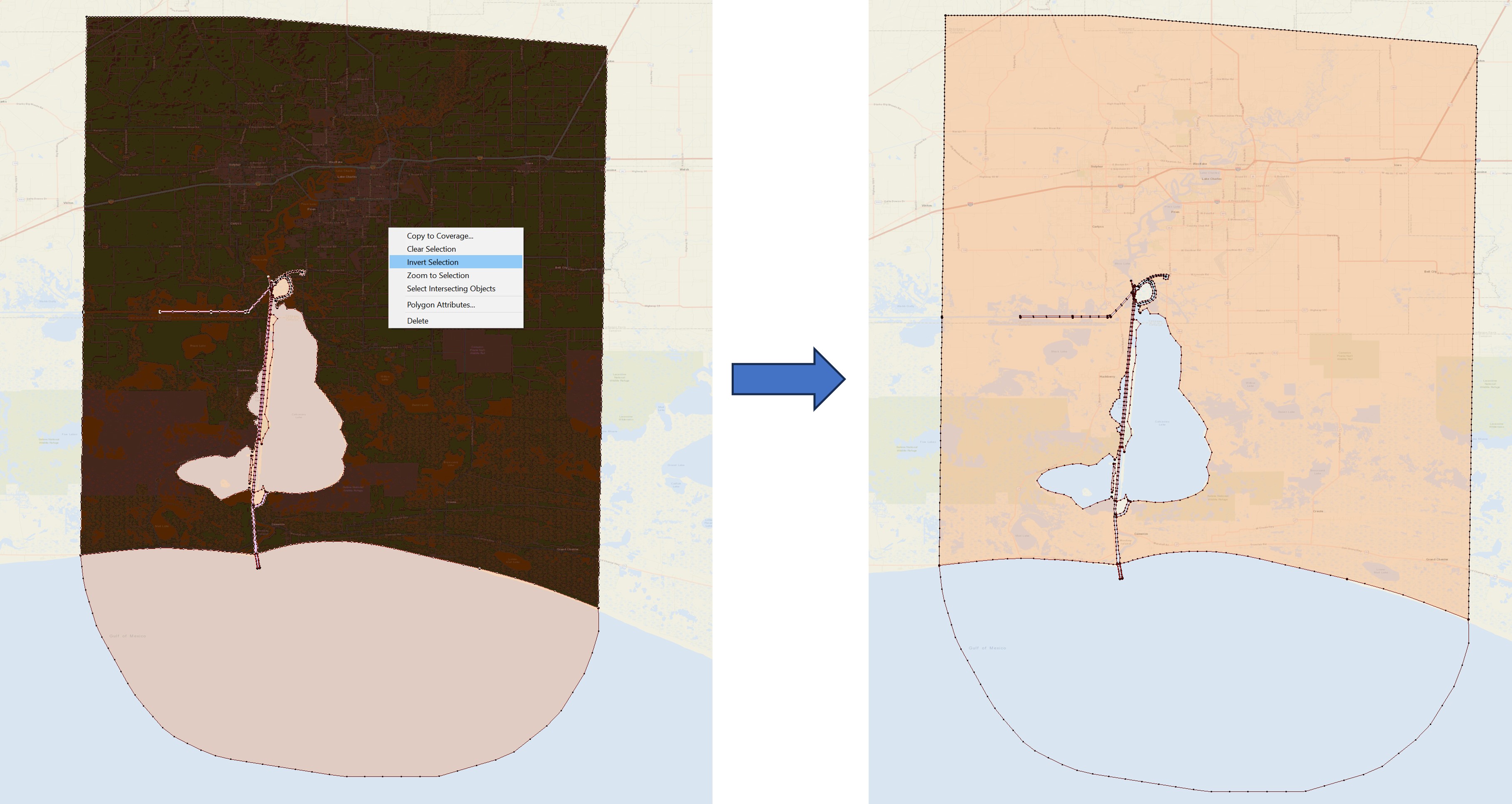 Selecting the watershed polygons may involve much labor because many small polygons are generated after the river arcs are merged into the final map. Instead of manual selection, use the "select*" map coverage to select all polygons more efficiently.