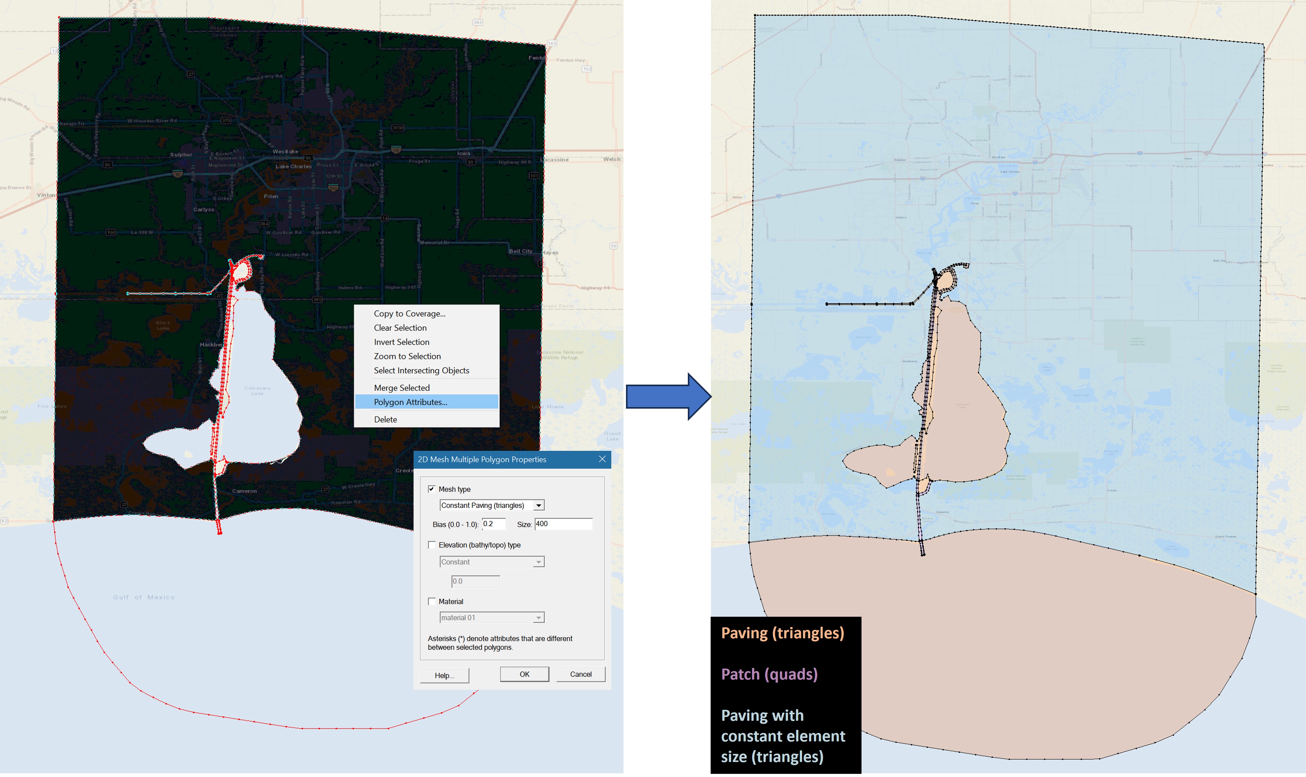 - For STOFS3D, right click on the selected polygons and set "mesh type" in "polygon attributes" to scalar paving density:
